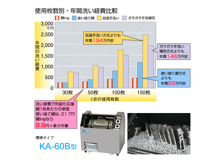 使い捨て網を消費するよりも、通常の網を網ingで洗浄しながら使い続ける事でコスト面はもちろん、環境にも配慮した店舗経営をしていただけます。